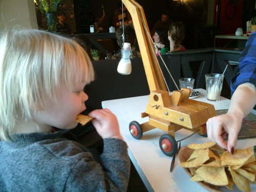 Mika confiscated a 40 year old crane and uses it to transport milk for dads coffee
